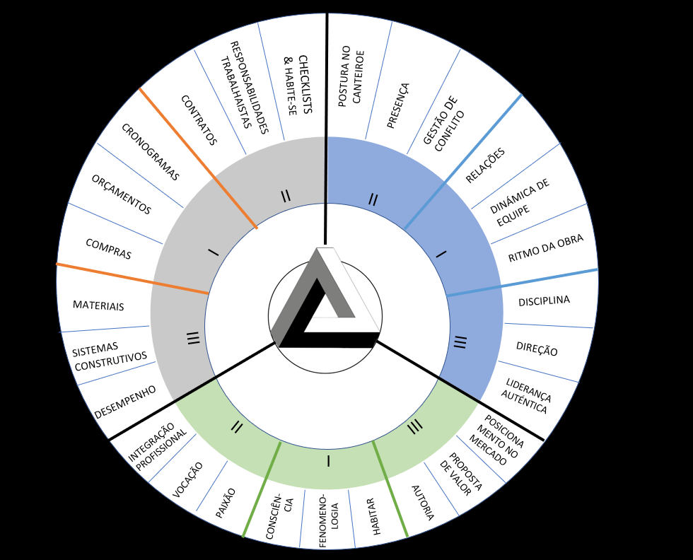 Cada dimensão se desdobra em três domínios, assim cobrindo os nove domínios essenciais da atuação do arquiteto na obra.